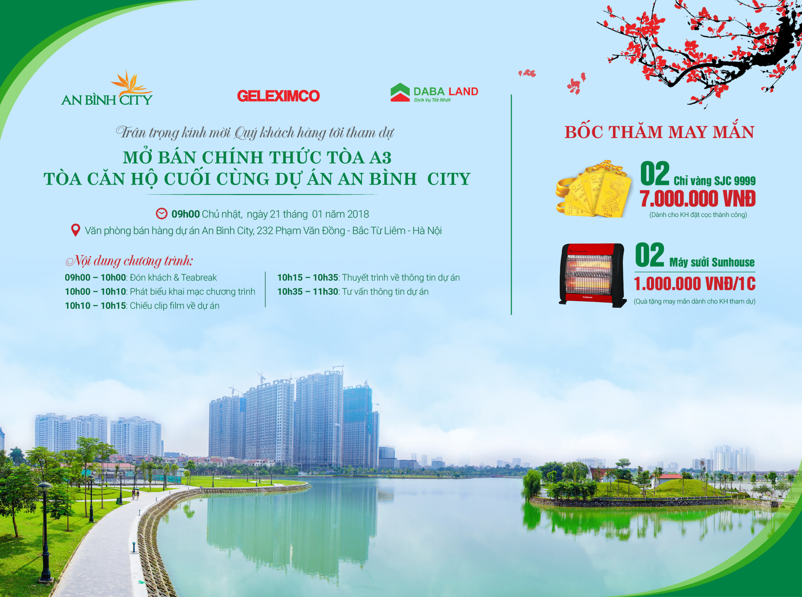 Đây là chương trình ưu đãi hấp dẫn của Tập đoàn Geleximco – Công ty Cổ Phần thực hiện nhằm tri ân các khách hàng mua nhà dự án An Bình City. Theo đó, Geleximco dành nhiều quà tặng cho khách hàng khi đến tham dự mở bán hàng tuần. Các khách hàng đặt cọc mua nhà chưa tham gia bốc thăm trúng thưởng các lần trước thì sẽ được tham gia sự kiện “ Mua nhà cuối năm, nhận phần thưởng lớn”, hứa hẹn sẽ mang đến cho khách hàng nhiều bất ngờ có giá trị lên đến hàng trăm triệu.