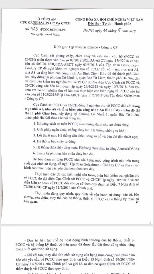 An Bình City đã thực hiện nghiệm thu vấn đề phòng cháy chữa cháy tại các tòa A1 và A8 và tại tầng hầm đạt chuẩn theo bộ công an PCCC trước khi tân cư dân tại hai tòa được nhận nhà chuẩn bị dọn đến ở, ngày 11 tháng 05 năm 2018 đã có văn bản từ bộ công an PCCC về thực hiện theo đúng quy trình quy định về vận hành sử dụng, bảo trì, sữa chữa, thay thế thiết bị PCCC và hệ thống kĩ thuật có liên quan. Đã duy trì liên tục chế độ hoạt động bình thường của hệ thống, thiết bị PCCC các hệ thống kĩ thuật được lắp đặt đúng chức năng trong quá trình sử dụng. Khi cải tạo hay thay đổi tính chất của hạng mục công trình phải đảm bảo yêu cầu về PCCC theo quy định tại điều 13 nghị định số 79/2014 NĐ CP ngày 31/7/2014 của chính phủ. Chủ đầu tư phải đảm bảo an toàn vấn đề PCCC tại các hạng mục công trình. Nếu xảy ra sai sót gì phải chịu hoàn toàn trách nhiệm trước pháp luật.