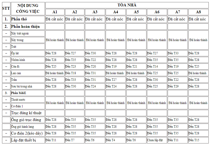 Song song với công tác xây dựng phần thô của 8 tòa nhà cao tầng, các nhà thầu cũng đẩy nhanh tiến độ ốp lát, trần, sơn bả trong nhà và thi công cơ điện tất cả các tòa nhà. Đồng thời, hệ thống cửa nhôm kính đang gấp rút hoàn thiện để hoàn tất một trong những công đoạn cuối cùng của mặt ngoài dự án.